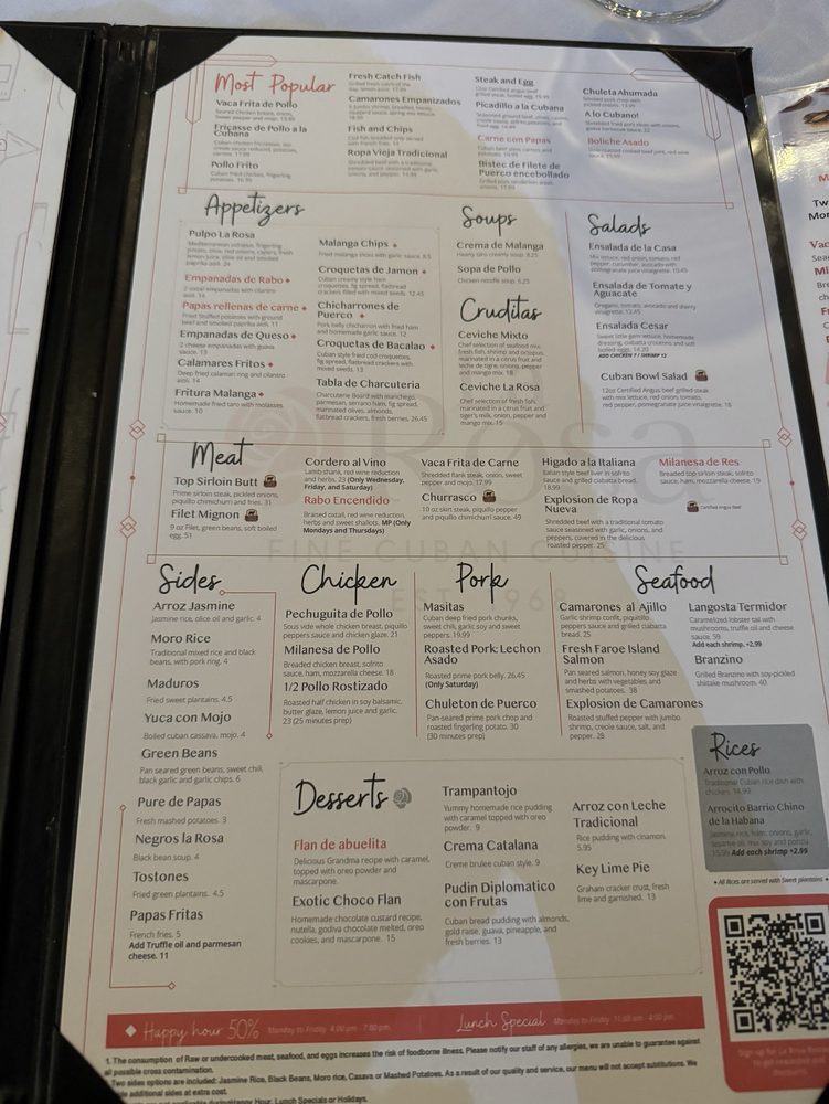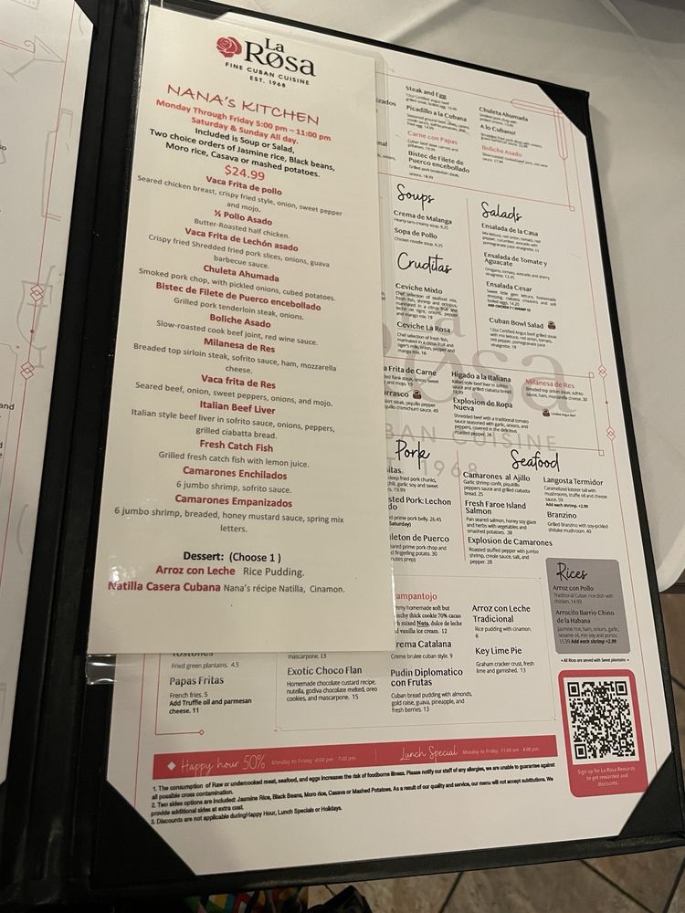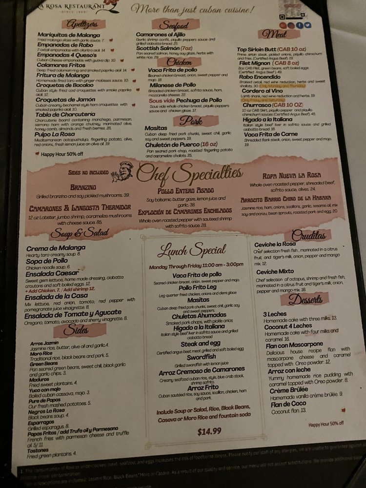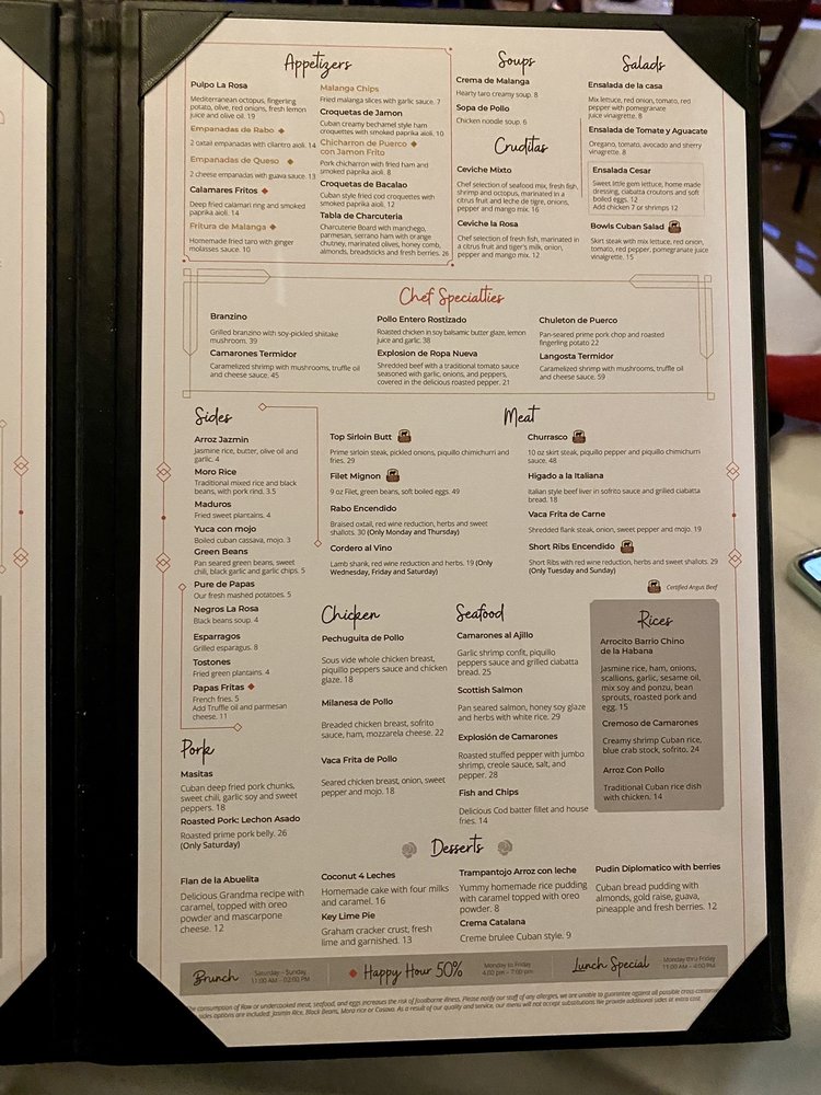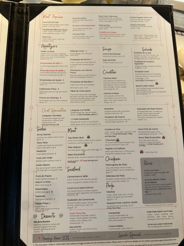 Welcome to La Rosa Fine Cuban Cuisine, where authentic Cuban flavors meet a lively atmosphere. Nestled in Miami, this charming eatery serves up an impressive menu bursting with vibrancy and freshness. Begin your culinary journey with irresistible empanadas and savor the mouthwatering Masitas with beans and rice that have guests raving. Vegetarians will delight in numerous options, while meat lovers can indulge in standout dishes like Vaca lechon asado and perfectly cooked fish, enhanced by flavorful sauces and seasonal sides.